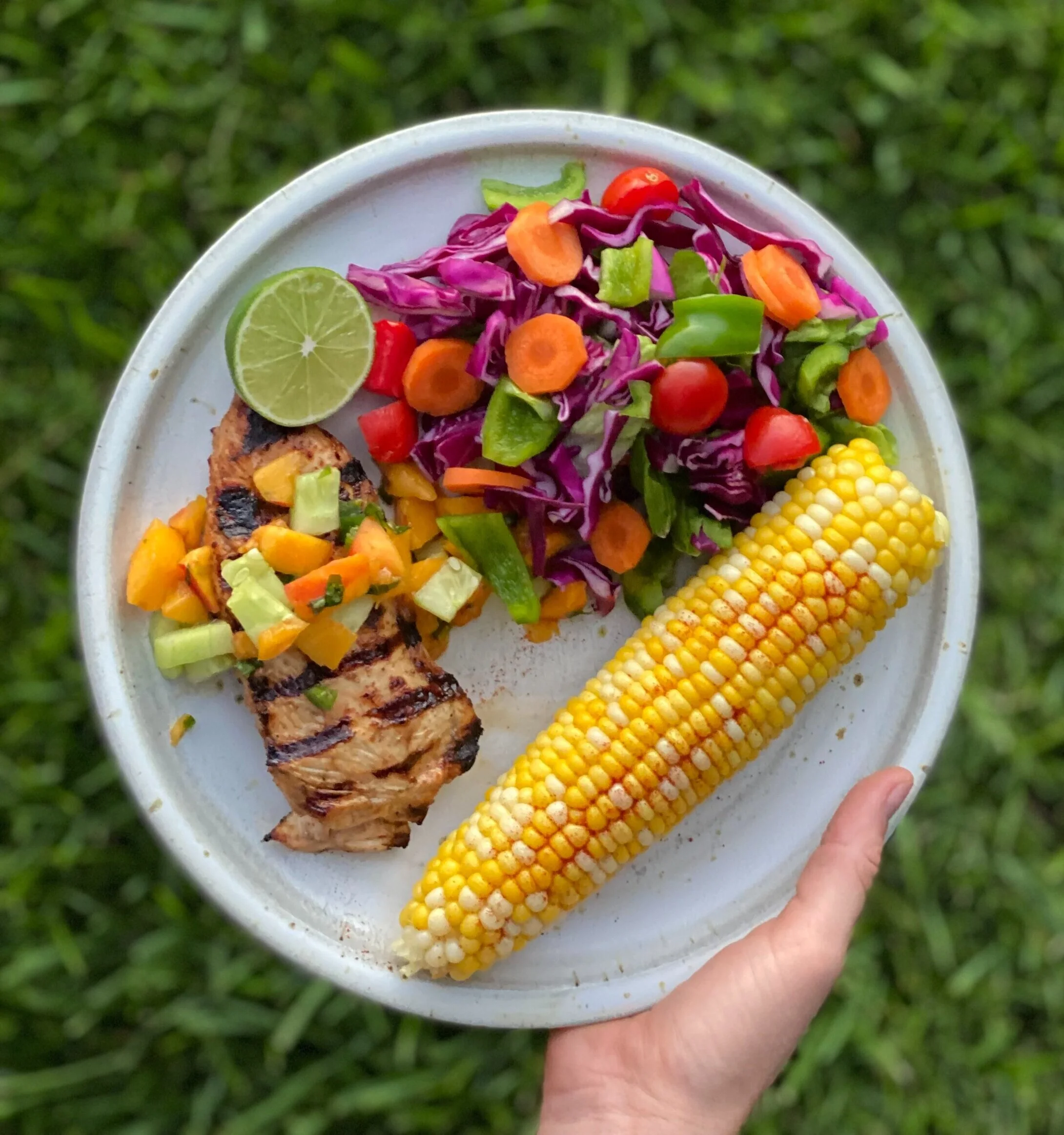 While chicken marinates, dice peach, cucumber, jalapeño, and onion. Lightly toss in a small bowl. Finely chop basil or cilantro and sprinkle on top.